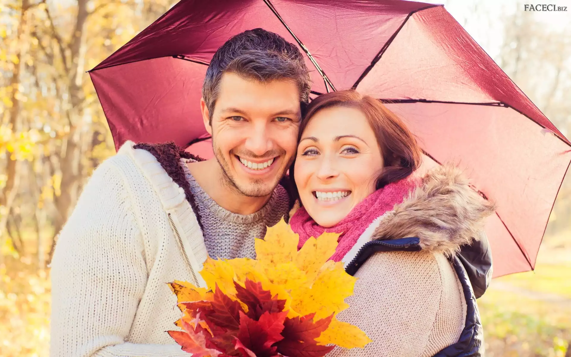 Para, Liście, Uśmiechnięta, Parasol - faceci.biz